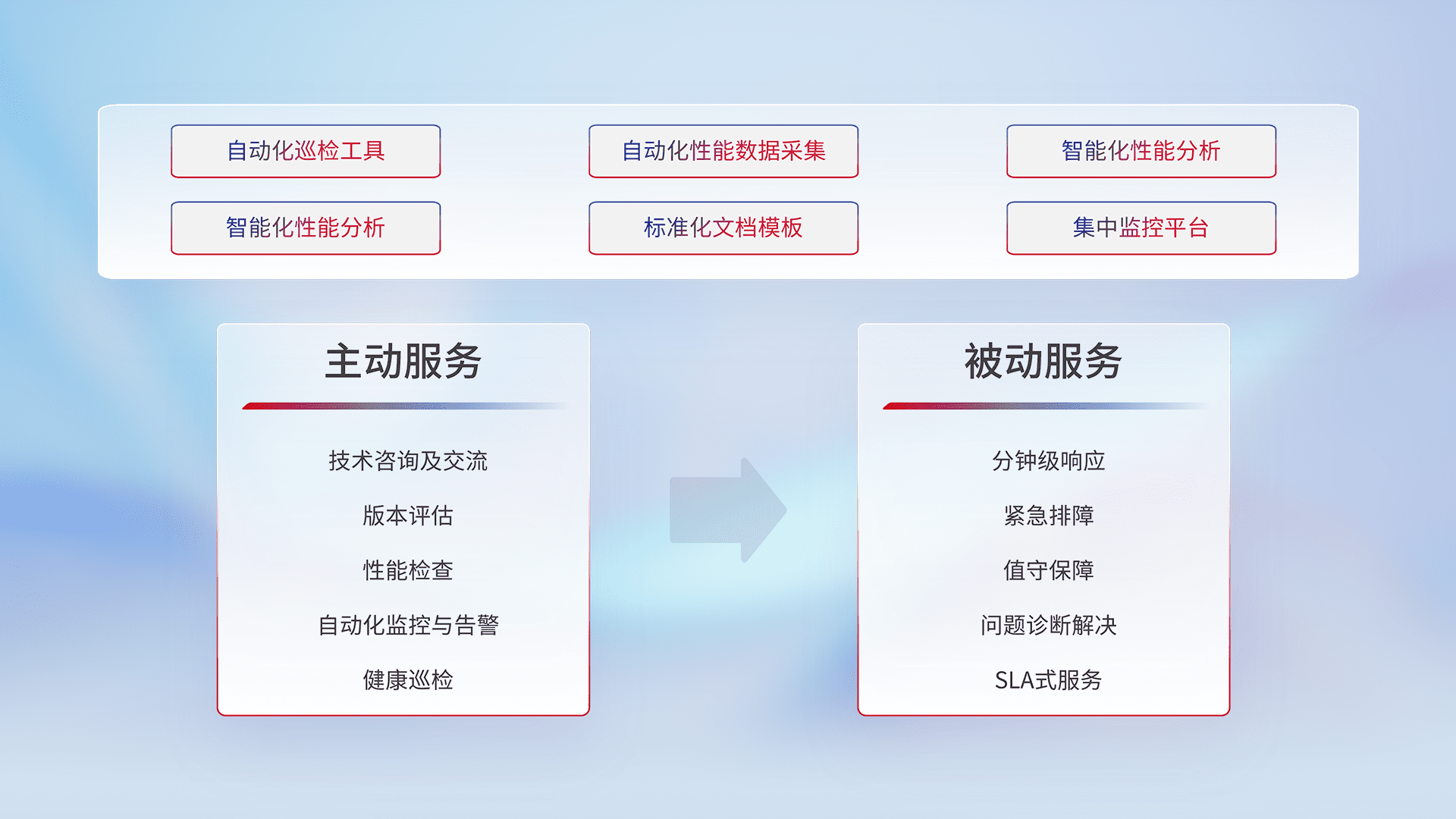 智能化工具和标准化文档,,,保障服务质量,,,,提供主动服务(包含技术咨询、、版本评估、、、性能检查、、自动化监控与告警、、健康巡检)和被动服务包含(分钟级响应、、紧急排障、、、、值守保障、、问题诊断解决、、、、SLA服务)。。